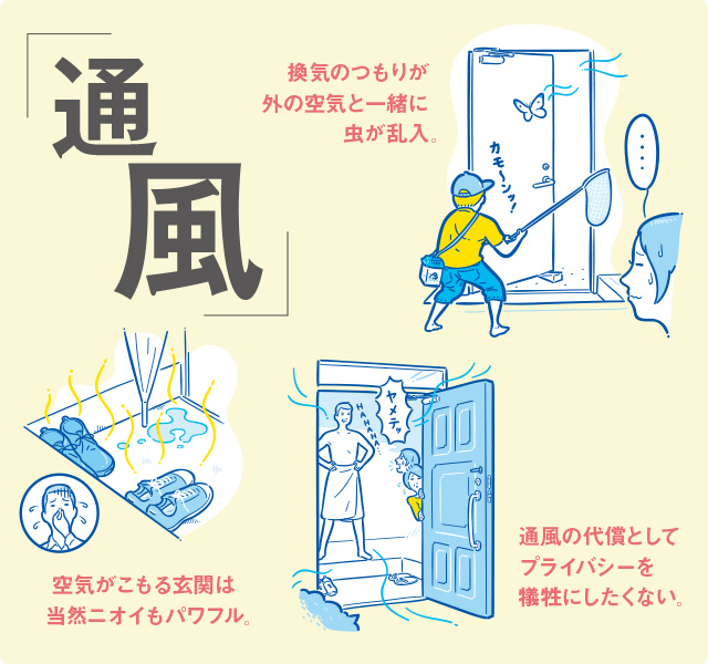 また、通風タイプのドアにすると、虫の侵入を防ぎながら、玄関の換気ができます。